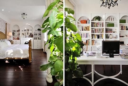 純白色的主臥設計帶有書房功能,主桌的款式也是專門定做的,雙人位的設計是方便兩人同時使用,書柜造型是借用了鄉(xiāng)村風格中的拱形門造型。床的一側(cè)也是一個裝飾柜,所不同的是中間造型做了一個壁爐,冬天取暖很實用的。