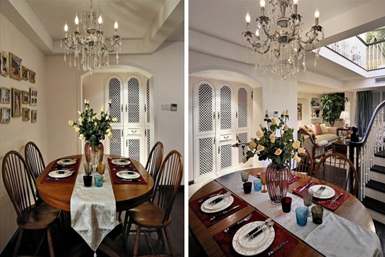 餐廳位置位于二樓上樓處,站在餐廳的一角剛好可以看到在整個別墅的大致結(jié)構(gòu),客廳,以及上二樓的樓梯位置 。餐廳與廚房也是通過鏤空型的門隔開,頗有幾分歐式風格的優(yōu)雅之美。