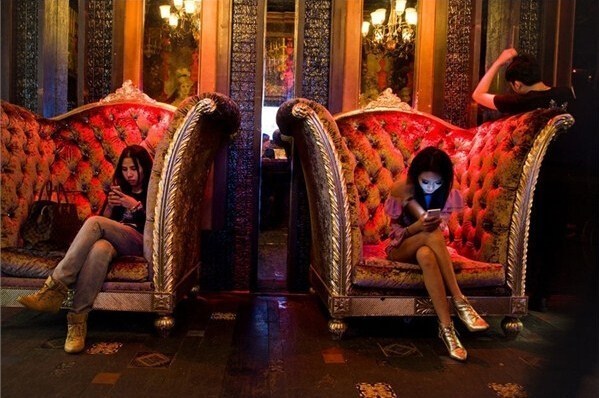 上海,一家夜總會(huì)入口處,坐在沙發(fā)上等待的女孩們。