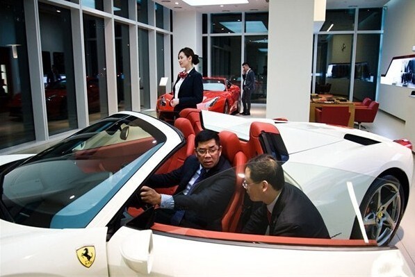 浦東世紀(jì)大道一間豪車展廳內(nèi),一位男士試駕報(bào)價(jià)450萬(wàn)人民幣的法拉利458 Spider。