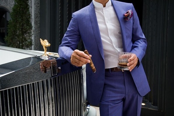 中國(guó)企業(yè)家塔羅斯拿著雪茄站在自己的座駕——一輛勞斯萊斯旁。